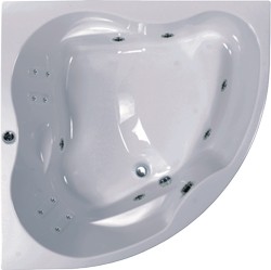 Large corner whirlpool bath with 14 jets, legs, pre-fitted pump. Size 1500 x 1500mm.